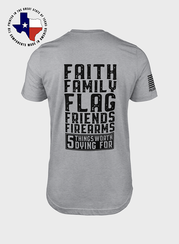 The FAITH • FAMILY • FLAG • FRIENDS • FIREARMS Shirt is a bold declaration of the values that define the American spirit. Built on faith, strengthened by family, united under the flag, supported by good friends, and protected by the right to bear arms—this tee represents the pillars that keep America strong.